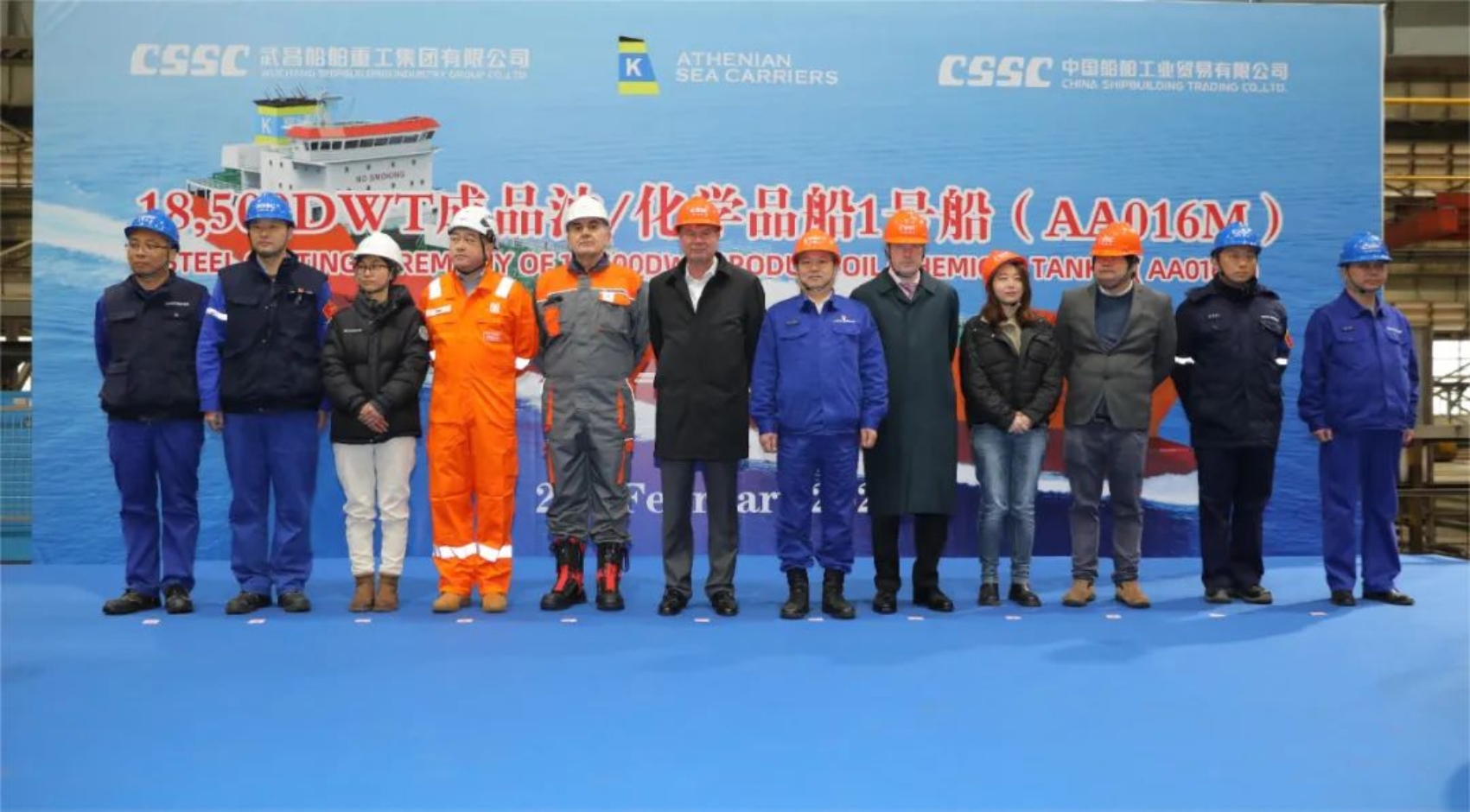2月20日下午,由中國(guó)船舶集團(tuán)武昌造船為希臘Athenian Sea Carriers公司建造的 18500DWT油化船1號(hào)船順利開(kāi)工。Athenian Sea Carriers、SeaQuest Marine、Braema、LR船級(jí)社、中船貿(mào)易及武昌造船等相關(guān)單位領(lǐng)導(dǎo)、來(lái)賓出席開(kāi)工儀式。