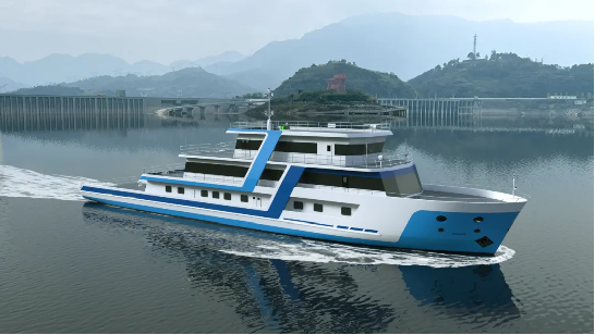 該船總長57.1米,型寬9.8米,型深3.5米,滿載排水量600噸,設計吃水2.1米、設計航速22千米/小時,采用圓舭線型、傾斜船首、方尾船型,全船采用鋼質焊接結構形式,采用雙機雙定距槳推進形式。是一艘主要開展水庫巡查、庫岸邊坡巡測、水文泥沙要素監(jiān)測、水環(huán)境取樣和實驗室檢測分析等工作的工作船。